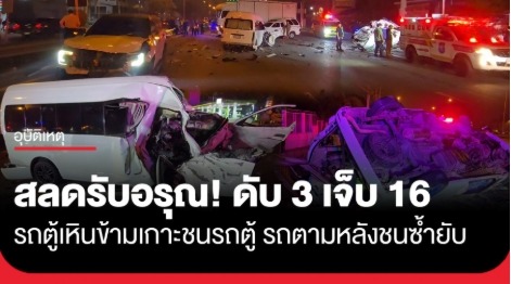 สลดรับอรุณ! รถตู้เหินข้ามเกาะชนรถตู้อีกคัน รถตามหลังชนซ้ำยับ ดับ 3 เจ็บ 16