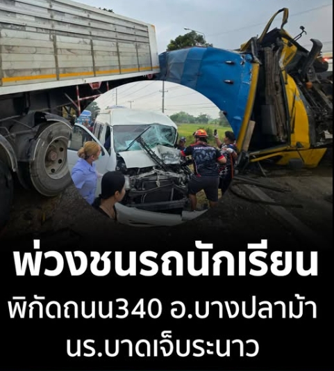 ด่วน! รถนร.ชนกันก่อนพุ่งใส่พ่วงเทรลเลอร์ ที่บางปลาม้า บาดเจ็บระนาว